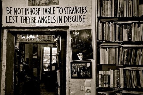 And in all of these, ineffable does not mean infallible, but the ineffable does permeate the human. I find that both comforting and inspiring. I’ve always appreciated the King James language of “entertaining angels unaware” and the similar language in the famous sign that hangs in the Shakespeare and Company bookstore in Paris at the top of this post. I like to think of Wenders-esque angels lingering there and in other bookstores, as in the library in the movie. Perhaps this is what draws me to these portrayals of angels, that they are everywhere, offering the potential for enchantment and comfort–just as music and books and film offer, too. Like the song that I named this post after–let’s spend some time during this festive season enjoying such enchantment.